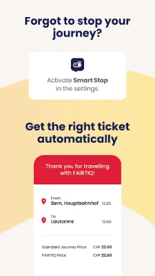 FAIRTIQ inakuweka tayari kwa kila hali. Ikiwa mhudumu wa tiketi atahitaji uthibitisho, bonyeza tu kitufe cha "Onyesha tiketi," na msimbo wako wa QR utaonekana papo hapo, ukihakikisha upitaji laini na usio na usumbufu. Baada ya kufika mwisho wa safari yako, telezesha kitufe cha "Simamisha" ndani ya programu. FAIRTIQ itakokotoa kiotomatiki gharama bora zaidi kwa safari yako yote, ikikuhakikishia malipo ya haki kila wakati. Na kwa 'Hali ya Mwandani', si wewe tu bali pia wasafiri wenzako mnanufaika na urahisi huu wa kipekee wa kupata tiketi halali kwa kugusa tu.