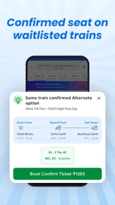 ixigo inasimama kama mshirika wako wa kuaminika katika safari za Reli za India, ikikupa uzoefu usio na kifani wa uhifadhi wa tiketi. Imethibitishwa na IRCTC na kukadiriwa juu kwa kiwango cha 4.7 na watumiaji zaidi ya milioni 3, ixigo inahakikisha urahisi na usalama katika kila hatua. Ukiwa na 'Alternate Travel Plan', unapokea marejesho hadi mara 3* ikiwa tiketi yako itabaki kwenye orodha ya kusubiri, ikikupa amani ya akili isiyo na kifani. Zaidi ya hayo, kipengele cha 'Assured' kinakupa uwezo wa kughairi tiketi zako bila malipo na kupata marejesho kamili papo hapo.