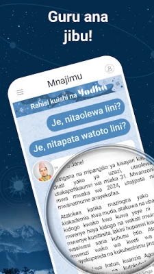 Safari yako ya kuelekea ufahamu ni rahisi sana ukiwa na Yodha. Kwanza, jenga wasifu wako wa kibinafsi wa kuzaliwa. Kisha, weka swali lako la kina kwa wataalamu wetu. Mwanajimu mwenye ujuzi ataandaa chati yako ya natali na kutoa majibu yaliyojawa na hekima ya kale. Iwe una changamoto za kimapenzi kama vile "Lini nitapata mwenzi wangu wa maisha?" au "Je, tunafaa kuwa pamoja?" hadi maswali ya hatima na kusudi la maisha, Yodha inakuletea majibu ya kina kutoka kwa wanajimu halisi waliobobea.